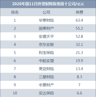 2020年前11月,外资财险公司保费收入仍能保持两位数增长的,一家是国泰财险,另一家是京东安联。