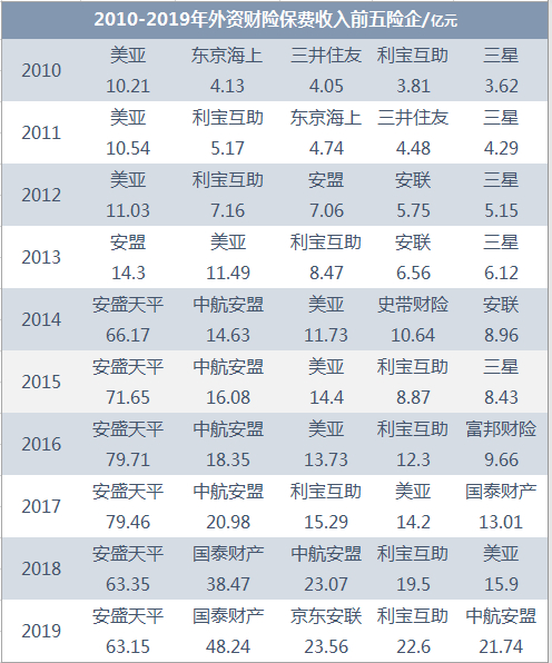 而在2010年以前,外资财险格局一直未有太大改变。美亚财险占据第一之位长达十余年之久,排名前五的也都是东京海上、三井住友、三星、安联等进入市场较早公司,但保费规模都偏低,仅美亚保费超过10亿。