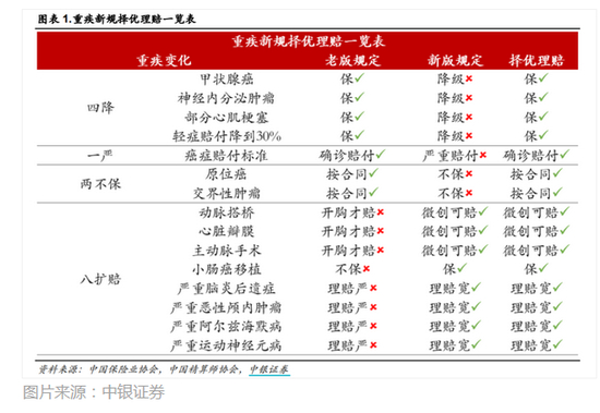 中银证券将此次重疾险规范的调整总结为“四降、一严、两不保、八扩赔”。