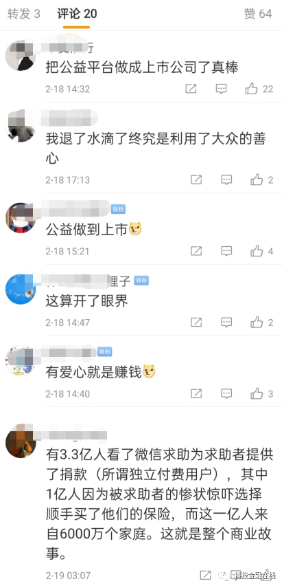 但是,水滴公司依托水滴筹等业务来聚拢大量人气,最后靠售卖保险来盈利的互联网商业模式,也引来了不少质疑。