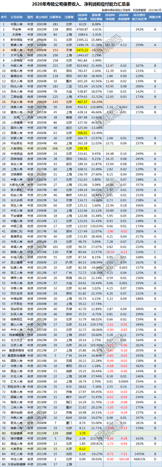 86家寿险公司2020年度保费收入、净利润排行榜