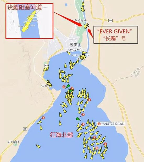 从集装箱货轮所处的位置来看,整个货轮与运河中心航线大约呈45度夹角,整个河道面几乎完全被拦住,造成这条国际航运大通道出现严重拥堵。上百艘货轮堵在苏伊士运河两端或运河中部的大苦湖等水域抛锚停泊,进退两难。其中包括大量从沙特、阿曼以及波斯湾沿岸国家向西欧、俄罗斯、美国运出的油船,国际油价甚至因此出现飙升,能源市场震荡。同时,部分未进入运河的货船或者延缓行程观望,或是被迫绕道非洲好望角。本次事故成为自2004年利比里亚籍10万吨油轮“Tropic Brilliance”号搁浅导致苏伊士运河中断三天以来,苏伊士运河所遭受的最严重事故。