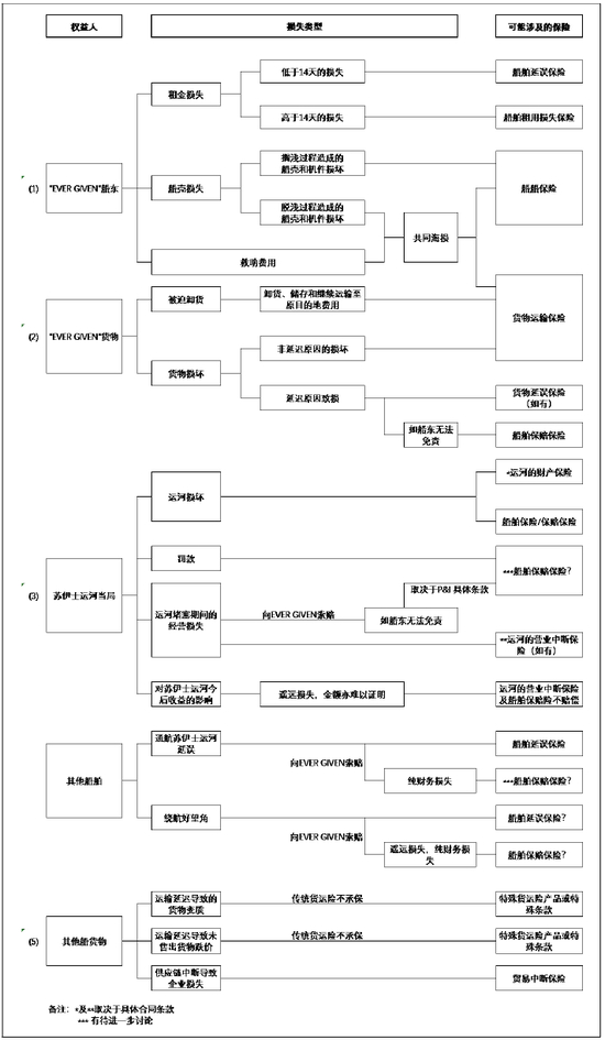 本次事件遭受损失的不仅仅是苏伊士运河当局,还包括各类船舶和货主以甚至供应链上各种企业,其背后的保险安排也异常复杂。本文尝试以各类损失为出发点,剥茧抽丝对其背后可能涉及的保险安排和索赔做如下简要分析: