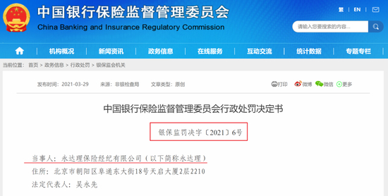 银保监罚决字〔2021〕6号显示,永达理存在给予投保人、被保险人或者受益人保险合同约定以外的利益;未按规定投保职业责任保险的违法行为。中国银保监会依法对永达理罚款合计40万元,就第一项违法行为对当事人李怀三警告并罚款10万元,就第二项违法行为对当事人吴怡珍警告并罚款10万元。