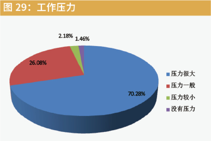 在工作压力方面,选择“压力很大”的营销员占比为70.28%,同比提高近一成,“压力一般”的占比为26.08%,同比降低9.54%,“压力较小”的占比为2.18%,“没有压力”的占比为1.46%(图29)。