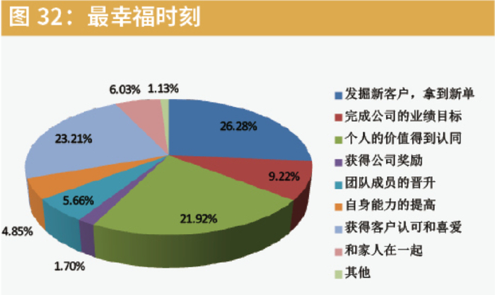 在“什么时候感觉到最幸福”的调查中,选择“发掘新客户,拿到新单”的营销员占26.28%,选择“完成公司的业绩目标”的占9.22%,选择“个人的价值得到认同”的占21.92%,选择“获得公司奖励”的占1.7%,选择“团队成员的晋升”的占5.66%,选择“自身能力的提高”的占4.85%,选择“获得客户认可和喜爱”的占23.21%,选择“和家人在一起”的占6.03%,选择“其他”的占1.13%(图32)。