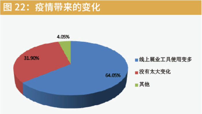 在疫情让展业方式发生的变化问题上,选择“线上展业工具使用变多”的占比 64.05%,“没有太大变化”的占比31.9%,选“其他”的占比4.05%(图22)。