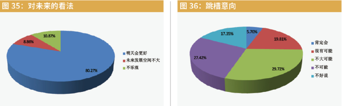 在营销员对行业未来的看法方面,认为“明天会更好”的占80.27%,认为“未来发展空间不大”的占8.86%,认为“不乐观”的占10.87%(图35)。