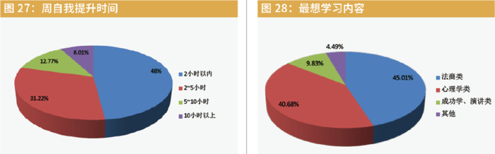 调查显示,公司培训之外,自我提升方面每周用时在“2小时以内”的营销员占比为48%,“2~5小时”的占比为31.22%,“5~10小时”的占比为12.77%,“10小时以上”的占比为8.01%(图27)。