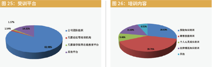 在营销员接受培训的平台方面,公司团队组织的占82.98%,天雁论坛等培训机构组织的占1.54%,天雁商学院等在线教育平台的占1.17%,其他平台的占14.31%(图25)。