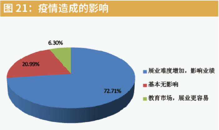在新冠疫情对工作的影响方面,认为“展业难度增加,影响业绩”的营销员占比为72.71%,认为“基本无影响”的占比为20.99%,认为“教育市场,展业更容易”的占比为6.3%(图21)。