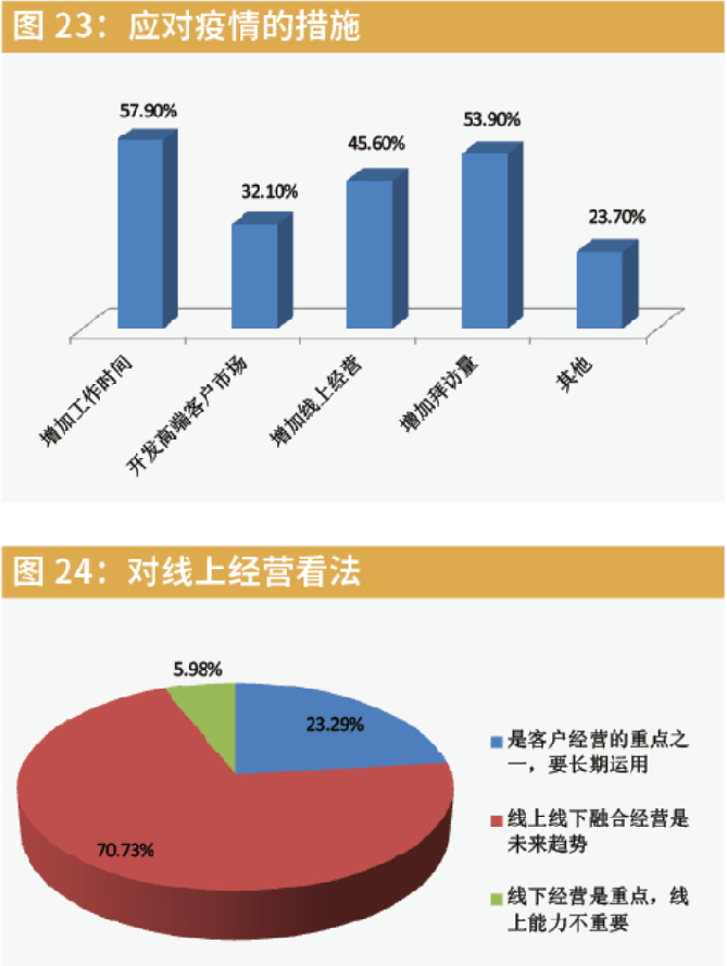 为了应对疫情带来的风险,营销员纷纷采取行动自救。选择“增加工作时间”的占57.9%,选择“开发高端客户市场”的占32.1% ,选择“增加线上经营”的占45.6% ,选择“增加拜访量”的占53.9%,选择“其他”的占23.7%(图23)。