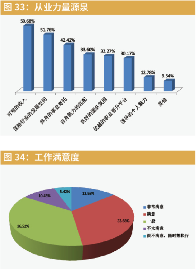 在从业力量源泉方面,选择“可观的收入”的营销员有59.68%,选择“保险行业的发展空间”的有51.76%,选择“终身的事业寄托”有42.42%,选择“自身能力的匹配”的有33.6%,选择“良好的团队氛围”有32.27%,选择“优越的职业晋升平台”有30.17%,选择“领导的个人魅力”的有12.78%;选择“其他”的有9.54%(图33)。