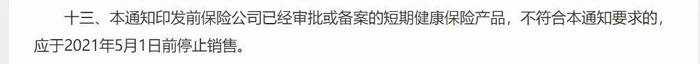 十三、本通知印发前保险公司已经审批或备案的短期健康保险产品,不符合本通知要求的,应于2021年5月1日前停止销售。