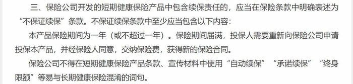 三、 保险公司开发的短期健康保险产品中包含续保责任的,应当在保险条款中明确表述为“不保证续保”条款。不保证续保条款中至少应当包含以下内容: