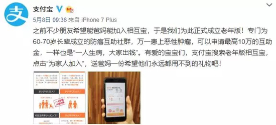 2019年5月8日,由于有不少用户反应爸妈买不了保险,继大病互助计划之后,相互宝又上线了专门针对60-70岁人群的“老年防癌互助计划”,即使是患有三高等慢性病的老人也可以加入,虽然保额只有10万,却也能在一定程度上解决大部分老年人的保障需求。