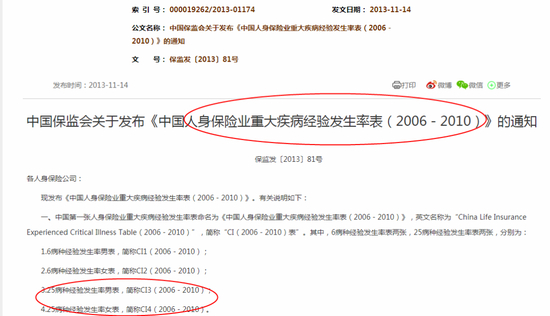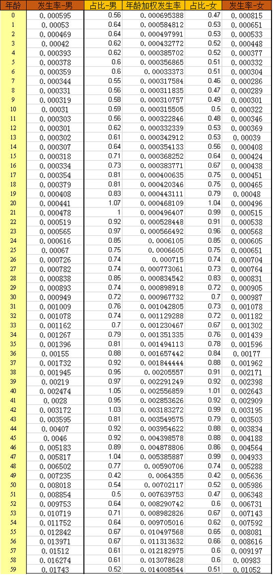 备注:《中国人身保险业重大疾病经验发生率表(2006-2010)》
