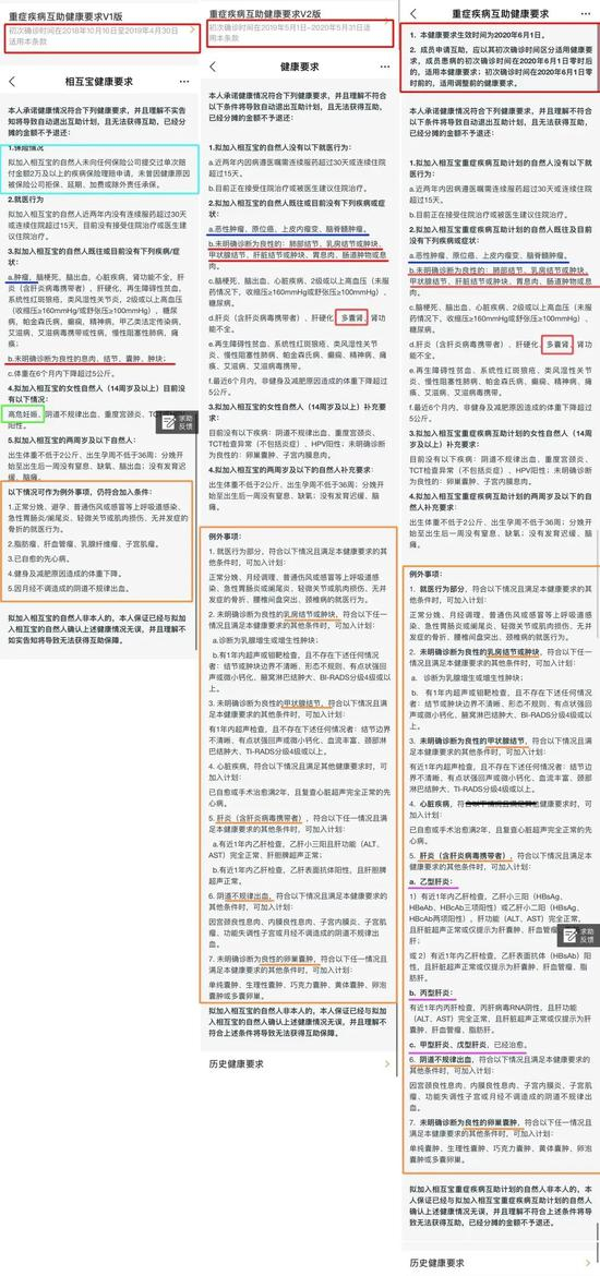 大眼一扫,相互宝的健康要求是越改越多,从原先的1、2页直接增加至现在的3、4页,第一反应可不就是越改越严格?