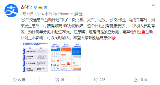 2020年8月31日,不局限于疾病互助,相互宝又上线了“公共交通意外互助计划”,几乎覆盖了所有公共交通工具,最高可申领100万互助金,