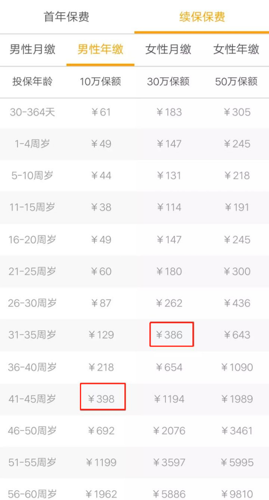 也就是说,同样的钱,在31-35岁你能买到30万保额,到41-45岁就只能买到10万的保额了,如果想要更高保障,就必然要掏更多保费。