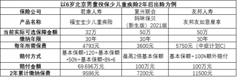 根据上述2020年中国国家卫生健康委员会发布的数据,白血病发病高发年龄段是2至7岁。如果6岁北京男童投保少儿重疾险2年后,患白血病,那么按其目前实际可投保君康福宝宝的最高保额为32万测算,与其他两款产品相比赔付情况如下: