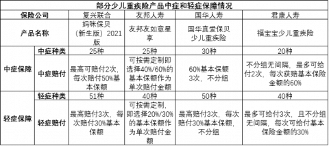 从上表中,可以看出君康福宝宝的中症和轻症涵盖的疾病种类均少于其他3种产品,赔付方式与其他3种产品方式基本一致。