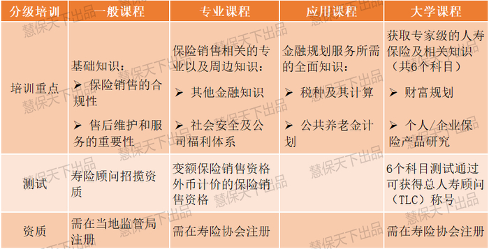 参考日本经验,培训内容可从一般课程扩充至专业、应用及继续教育课程,内容从寿险从业基础知识延伸至周边知识、金融规划知识等,时间从入司起延续2年,确保营销员能接受全方位的知识培训。同时为强化培训效果,各阶段均有监管层面的测试资质认证。