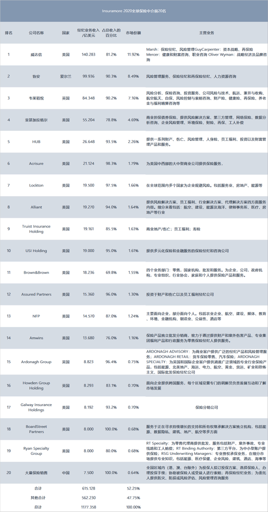 国际20强经纪公司中多以风险管理、咨询类业务为主,少有如国内市场般注重个人保险零售者为主。