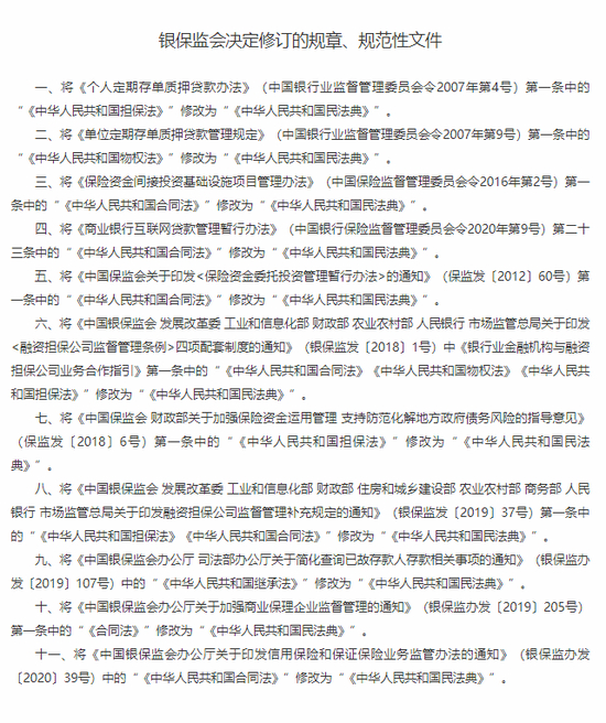“ 经过清理银保监会决定:对3部规章、115件规范性文件予以废止;对14件规范性文件宣布失效;对4部规章、7件规范性文件与民法典不一致的条款予以修订。”