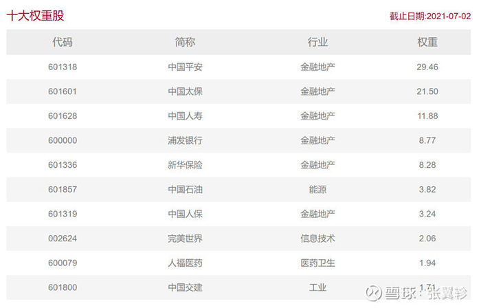 下表是其跟踪的中证保险主题指数的最新十大权重股: