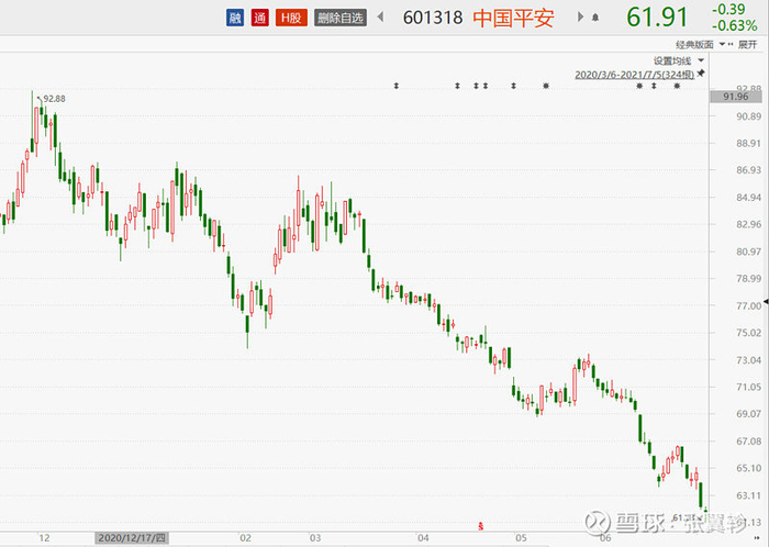 尤其看看保险股中的标杆中国平安,就是一波跌跌不休的走势。