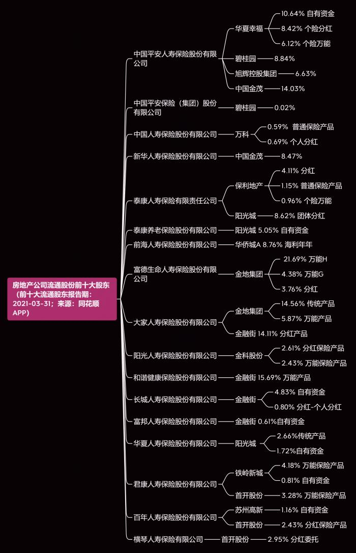 此外,截至报告期2021年3月31日,富德生命人寿持有金地集团29.83%股权;大家人寿持有金地集团20.43%股权;国寿股份持有万科1.28%股权;新华人寿持有中国金茂8.47%股权,泰康人寿持有保利地产6.22%股权、阳光城8.62%股权,等等。