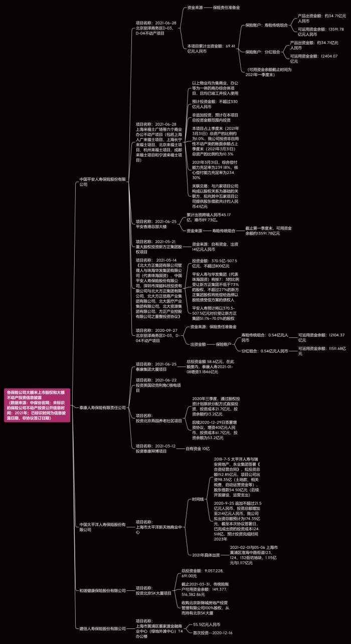 太平洋人寿上海太平洋新天地商业中心;和谐健康投资SK大厦项目;建信人寿上海黄浦区董家渡金融商业中心(绿地外滩中心)T4幢办公楼项目等亦都是大手笔。例如,和谐健康出资约90.6亿元,收购北京新锦城房地产经营管理有限公司100%股权,从而持有北京SK大厦。