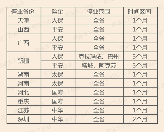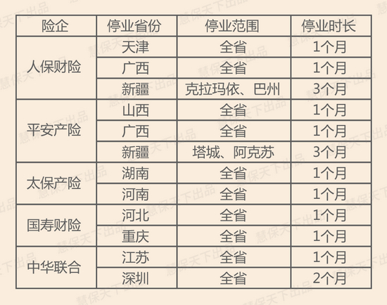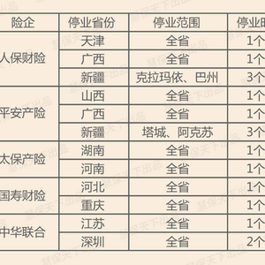 从停业的时间来看,最短1个月,最长3个月,似乎与受罚主体的体量大小有一定关系。一般在全省、全自治区、全直辖市范围内停业的分支机构停业时间最短,为1个月;人保财险、平安产险在新疆只在两个地级市停业,波及范围小,但停业时间最长,长达3个月;中华联合深圳分公司在全市范围内停业,其虽然不属于直辖市,但市场地位高,停业时间居中,达到了2个月。