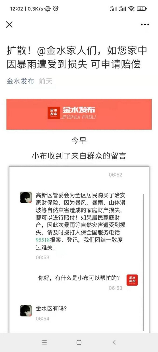 中原区委政法委为中原区居民购买了治安家财保险。如果辖区居民家庭财产和人身安全,因此次暴雨等自然灾害遭受到损失、伤害,可及时拨打人保全国服务电话95518报案、登记,后续核实后进行赔付。