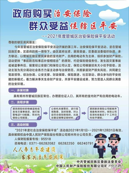 自2018年起,管城区委政法委就在市区内率先为全区居民购买治安家财保险,延续至今,内容涵盖辖区居民家庭财产损失、未成年人溺亡、重大恶性案件伤害、老人少儿走失寻找、精神病人伤人,以及见义勇为保险等方方面面,为辖区意外事件救助筑起保险安全屏障。