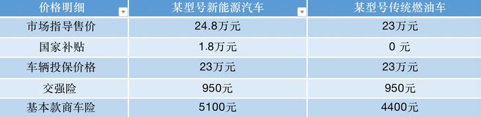 以投保价格均在23万元的新能源汽车和传统燃油车为例,交强险同样都为950元,而前者的商车险价格为5100元,后者为4400元。