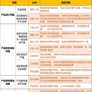 以此次通报中占用篇幅最大的产品条款表述问题为例,主要问题有三个,一是条款或名称表述不清,典型如产品名称或条款中混淆“恶性肿瘤”和“恶性肿瘤-重度”;二是条款表述不严谨,如免责条款归因不明,无法区分是否由意外伤害所致;三是条款表述涉嫌误导,如相关条款直接引用监管规定等。