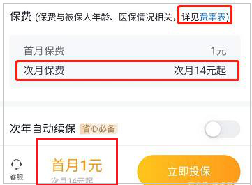 ▲“首月1元”很显眼,“详见费率表”不提醒很容易忽略。