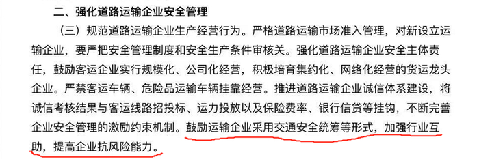 也是因此,2012年7月,国务院发布的《国务院关于加强道路交通安全工作的意见》(国发〔2012〕30号)中明确提出“鼓励运输企业采用交通安全统筹等形式,加强行业互助,提高企业抗风险能力”。