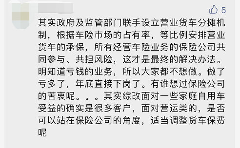 彻底解决保险与统筹之间的矛盾,关键还在于政府、监管以及行业的共同努力。在《被边缘化的千亿货车保险市场》一文发布后,“慧保天下”读者在后台留言,给出了很多建议,实际上,已经代表了业界的主流声音: