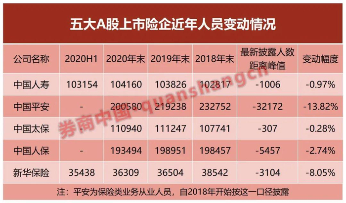 内勤员工方面,披露数据的中国人寿、新华保险,今年上半年员工分别减少1006人、871人,缩减比例分别为0.97%、2.4%。如果将视线拉长,五大上市险企最新披露的员工人数较2018年或2019年的峰值差距已超4万人,其中中国平安单家减员3.2万人。