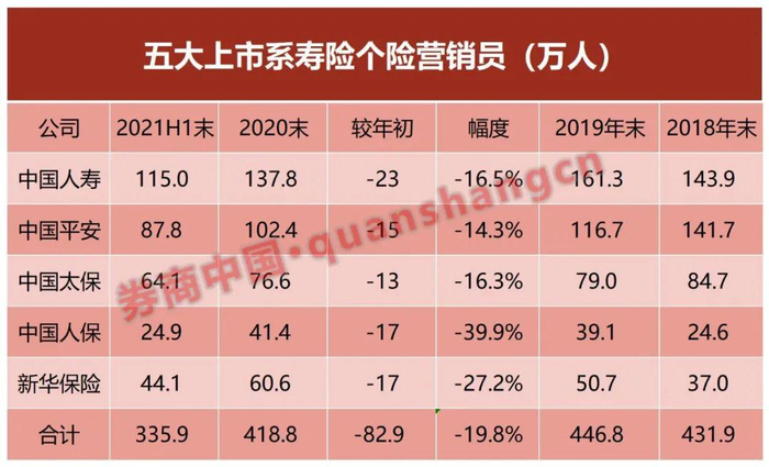截至今年上半年末,中国人寿、平安寿险、太保寿险、新华保险和人保寿险这五大上市系寿险公司,销售人力总数合计为336万人,较2020年末的419万人减少83万人,半年降幅达到19.8%。