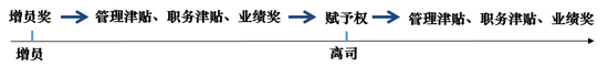 如果采用赋予权方式,“孤儿保单”归招募者或主管,主管原有利益链不断,不仅可以继续享有管理津贴、职务津贴和业绩奖,而且还可以通过享有赋益权进一步获得招募利益,使主管实际得到的利益不仅没有因为下属离职而减少,反而有所增加。被招募者离司时业绩越大,主管获得的赋予权利益越多,主管不仅增员的动力也就越大,管理督促业务员提升业绩的动力也越大。日积月累,许多主管本身靠这种赋予权制度积累了大量的客户资源,形成长期稳定的收入,有利于主管队伍的稳定。见下图所示。