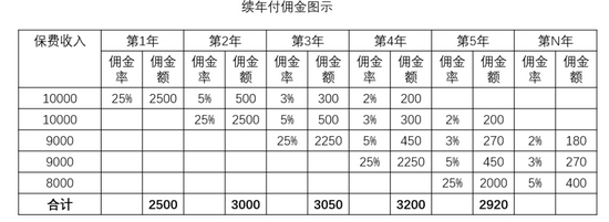 对于新招募的代理人来讲,续年付佣方式因为还没有佣金积累,首年佣金额相对较低,这也是保险公司给予“新人津贴”的原因。