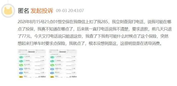在黑猫投诉上,关于悟空保的投诉达5000多条。大部分投诉者都表示在不知情的情况下被自动投保、自动扣款,且退保退款困难。而在微博等社交平台上,也有不少网友表示经历过同样情况。