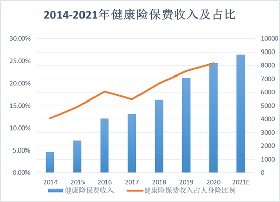 近几年,在民众保障意识觉醒、监管引导保险回归保障、保险公司积极转型的大背景下,健康险是人身险产品中增速最快的险种,2020年健康险保费收入为8173亿元,2015年到2020年健康险的复合增长率达到27%,健康险在整个人身险保费中的占比也攀升至24.5%。