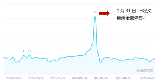 2020-2021年,重疾险因新旧定义的切换再一次成为市场的焦点。百度指数显示,重疾险在2021年1月末的市场关注度达到历史新高点(以网民在百度的搜索量为数据基础,以关键词“重疾险”为统计对象,分析并计算出该关键词在百度网页搜索中搜索频次的加权)。《重大疾病保险的疾病定义使用规范(2020年修订版)》和《中国人身保险业重大疾病经验发生率表(2020)》于2020年11月5日正式发布,约定了新旧定义并存的过渡期到2021年1月31日,这一时点也成为新旧定义重疾险的分水岭。