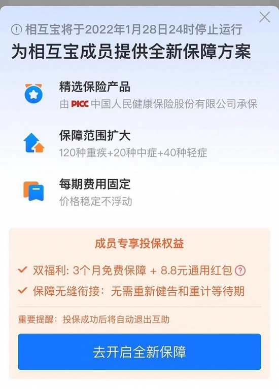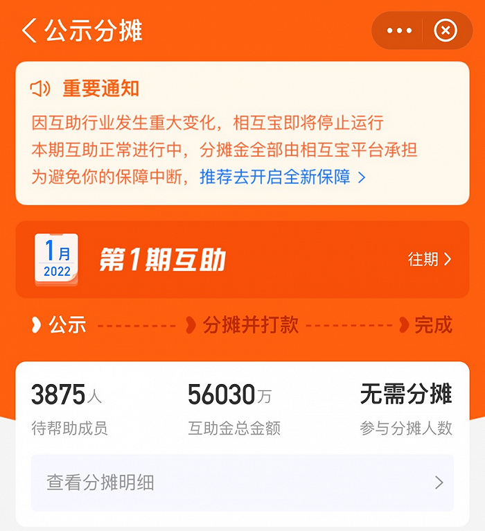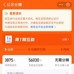 此前,相互宝公告表示,由于互助行业发生重大变化,将于2022年1月28日24时停止运行,符合规则的患病成员依旧可按照互助规则申请互助。平台将承担关停前的3期分摊金。为避免成员保障中断,相互宝建议成员根据自身保障需求自主选择全新保障方案。