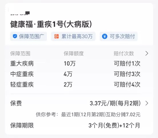相较于相互宝只针对大病保障,“健康福”系列重疾险的保障范围有所扩大。以面向0-59周岁用户的“健康福·重疾1号”为例,其保障范围涵盖重大疾病、罕见病以及多种中症、轻症疾病。此外,区别于相互宝的一次性互助,“健康福·重疾1号”是多次赔付设计,其中,0-39周岁总保障额度为30万元,40-59周岁为10万元。根据所患疾病程度不同,参保用户可申请多次理赔。